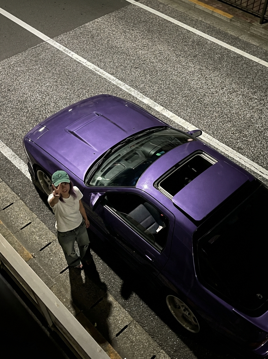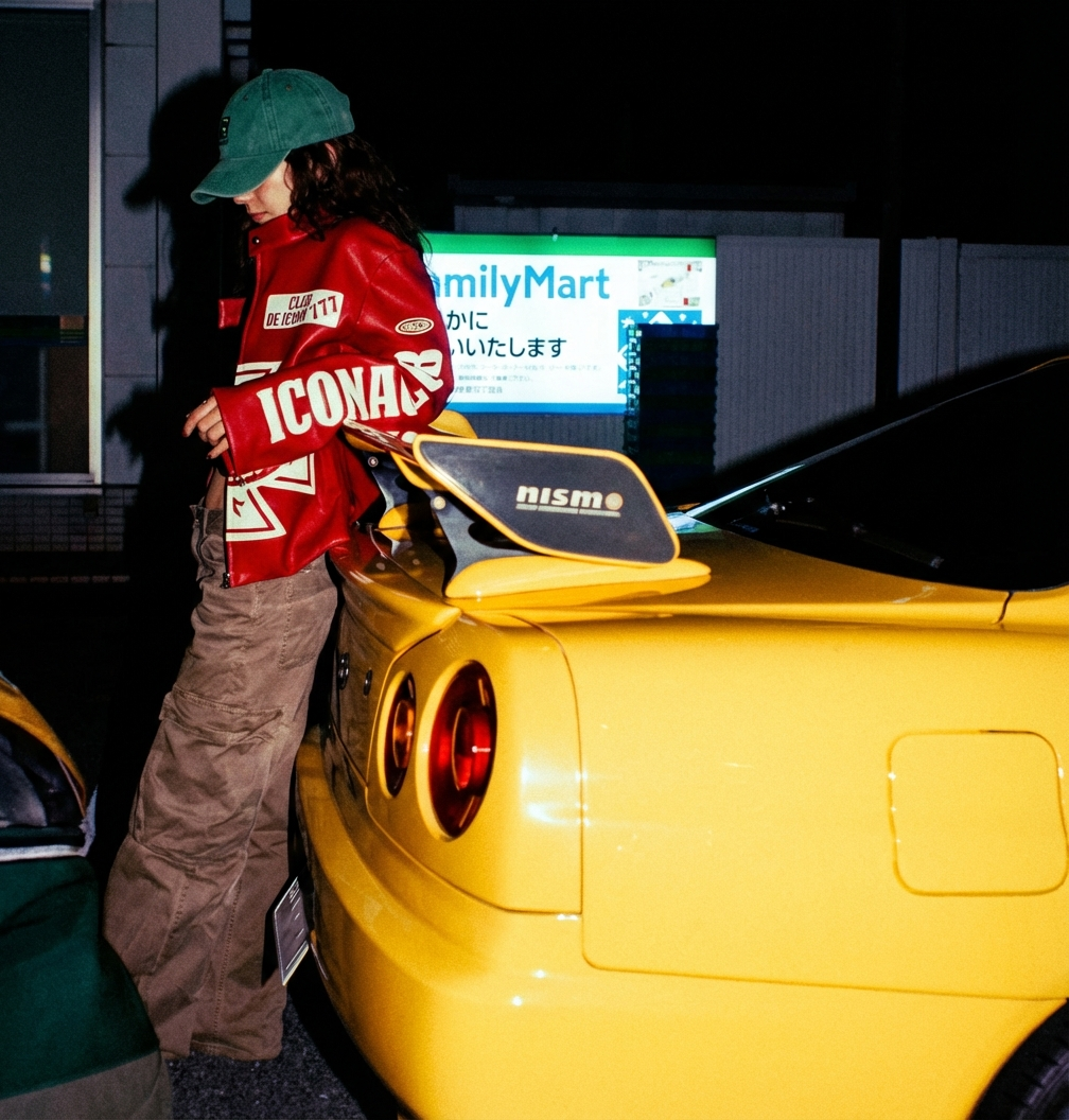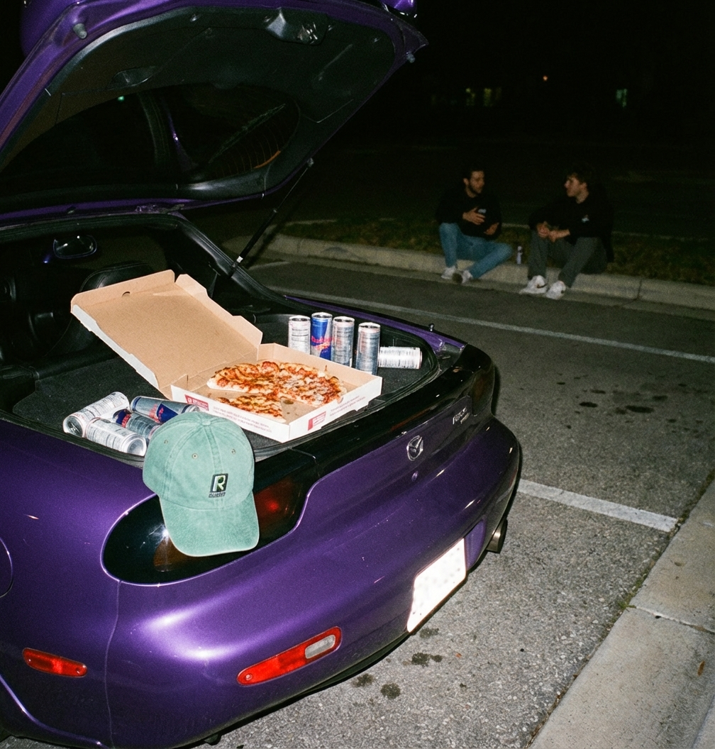 The concept came from understanding that car culture lives in these in-between spaces more than on the track. Someone leaning against a yellow car outside FamilyMart at 2am tells you more about the culture than any staged action shot, and a pizza box spread across a purple RX-7's trunk while friends sit on pavement talking shows what these gatherings actually look like.